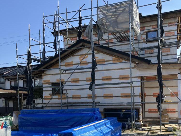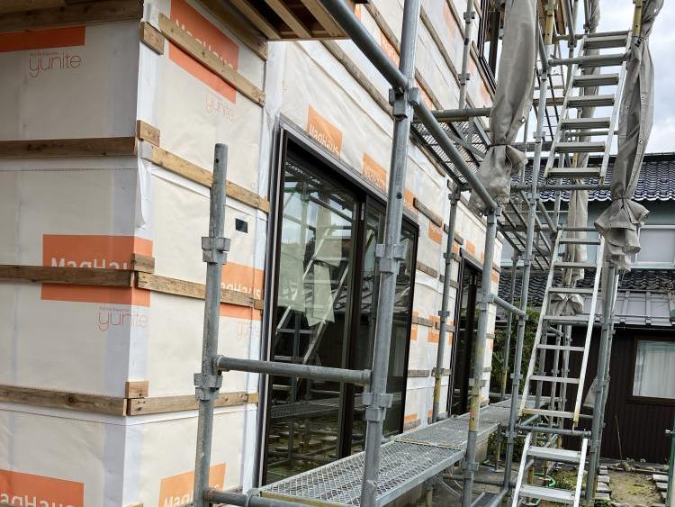 外壁を貼る準備として、透湿防水シート(写真にある白のシート)を貼ります。
