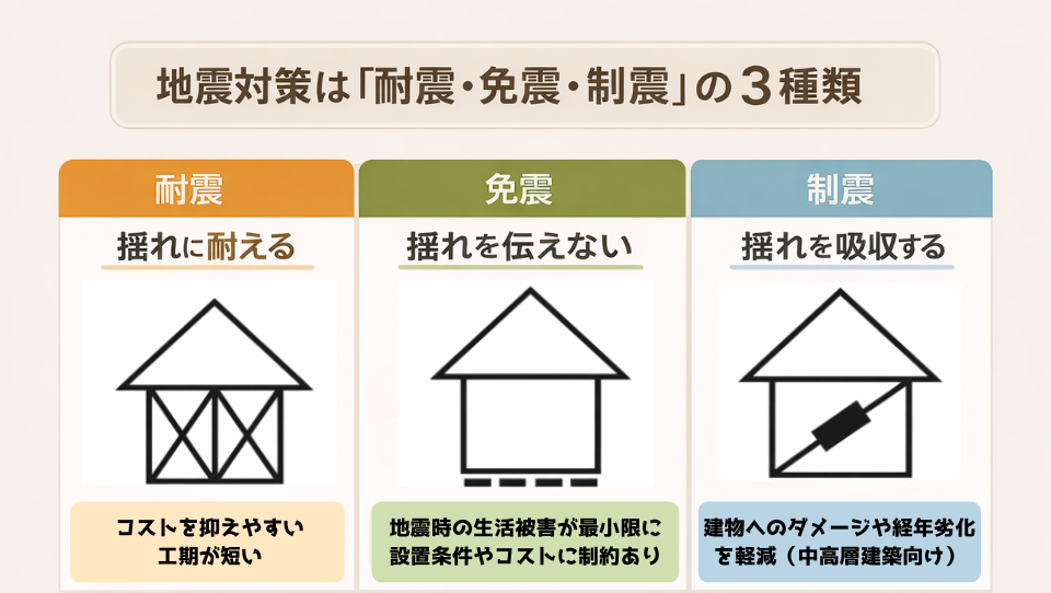 戸建てで一般的なのは 耐震と免震です。制震は主に中高層ビル向けで、戸建てで対応できるメーカーは現状だとあまりありません。それぞれ強みが違うため、住まいの状況や予算に合わせて選ぶのがベストです。