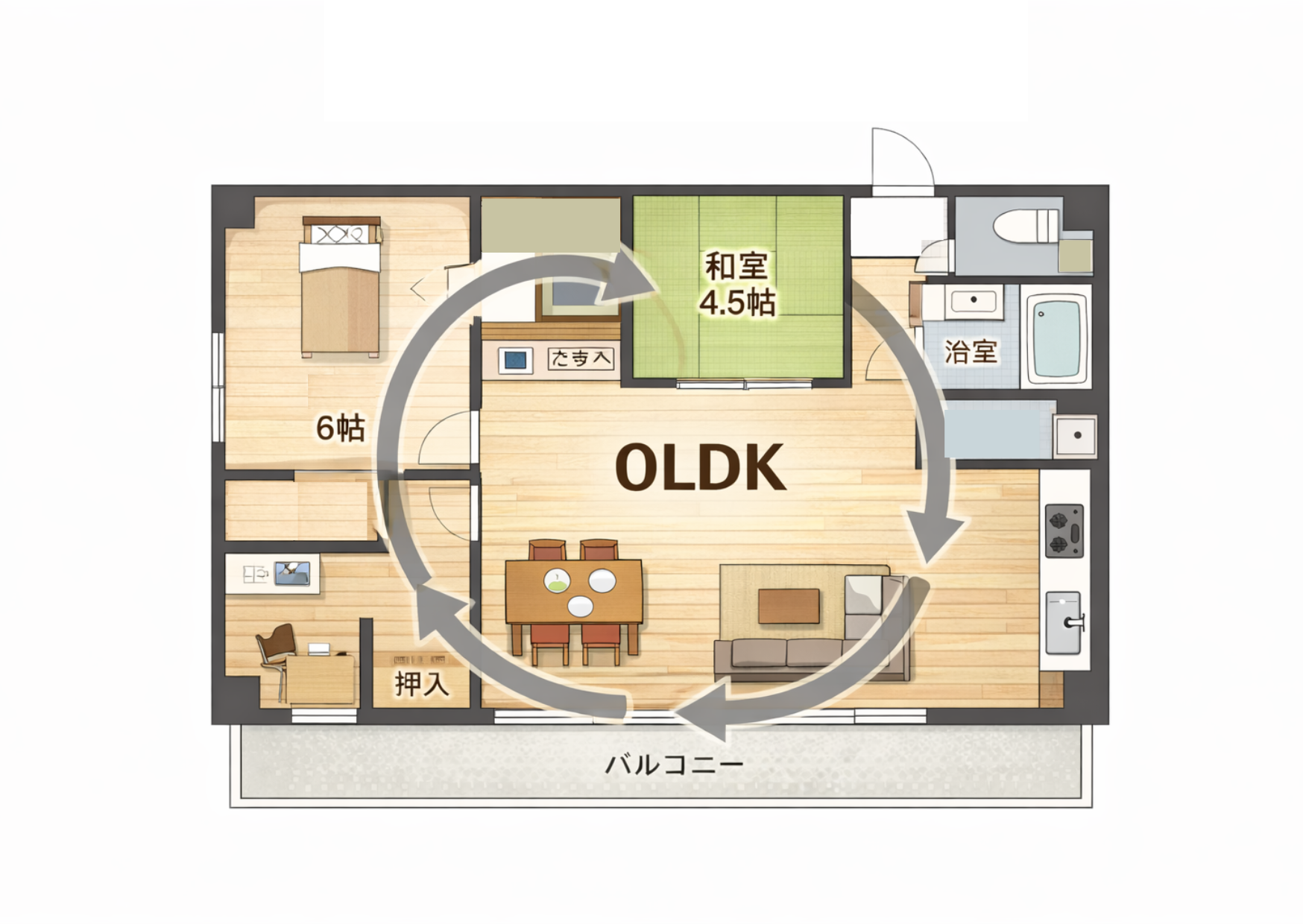 仕切りのない「0LDK」は、居室とリビングを分けず、ひとつの大きな空間として使う間取りです。