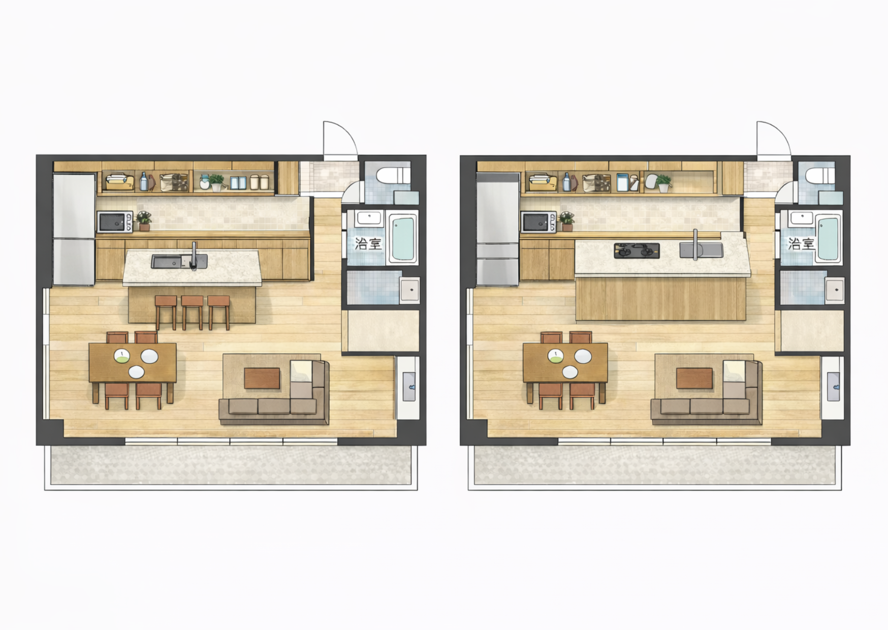 ペニンシュラ・アイランドキッチンの違いは、こちらの記事で説明しています。ぜひ参考にしてください。