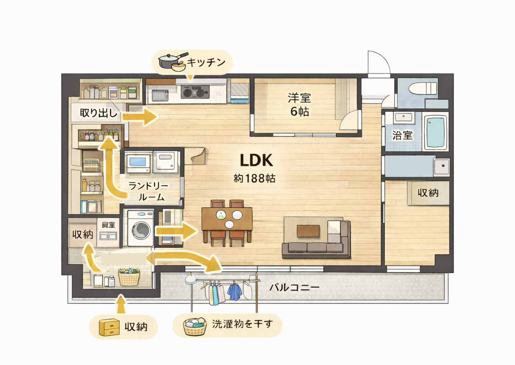 家事動線を重視した間取りは、共働き世帯や子育て世帯を中心に支持されています。洗濯、干す、収納するまでの動きを一か所で完結させるなど、無駄な移動を減らす工夫が特徴です。