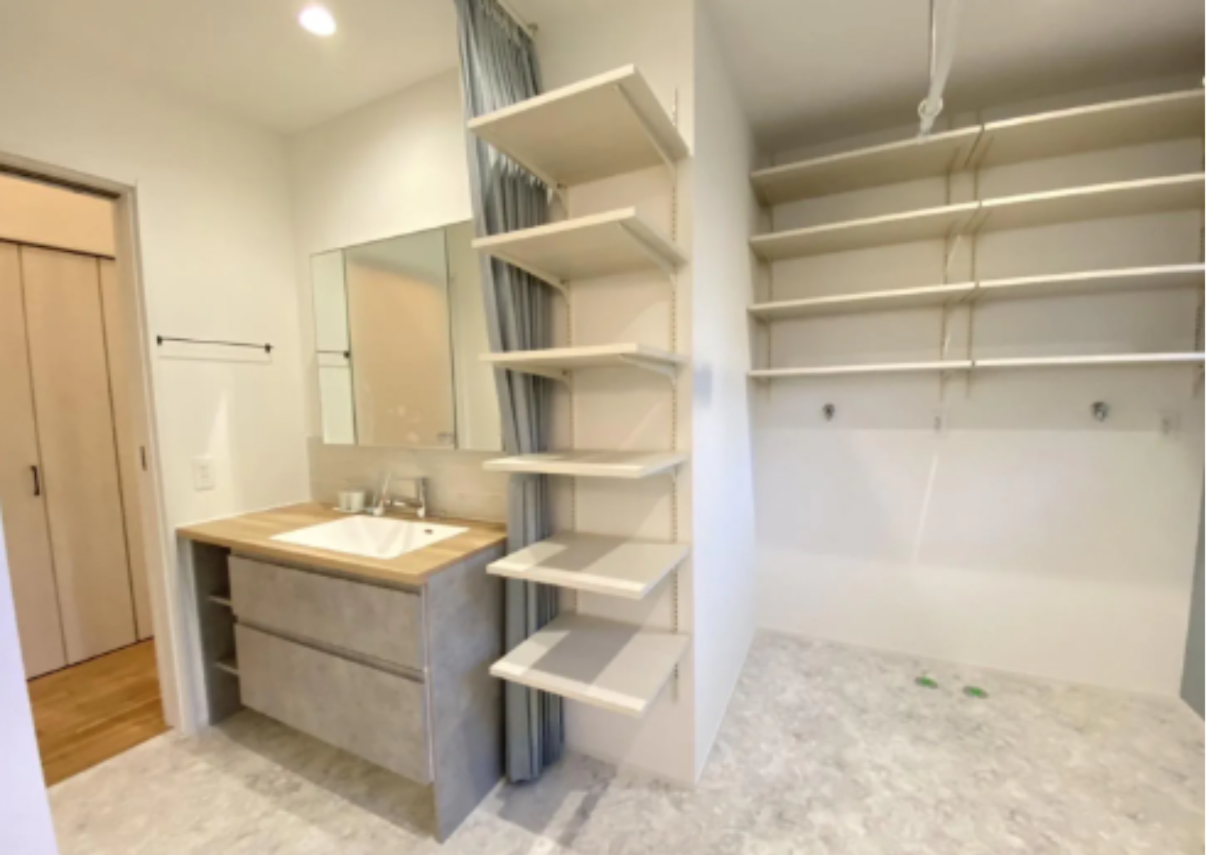 こちらのお宅では、脱衣所の中央に扉を設置することで、洗面スペースと脱衣スペースの2つに分けられるように工夫しました。