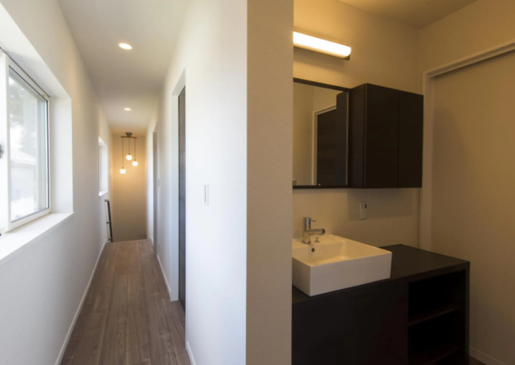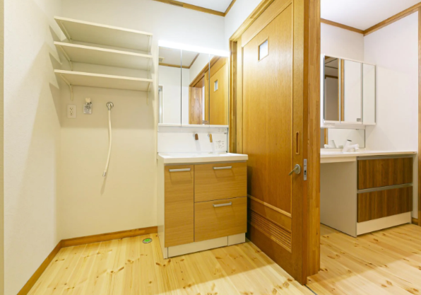 こちらのお宅では、脱衣所スペースに扉を設置して空間を二分したことに加え、両方に洗面台を設置。