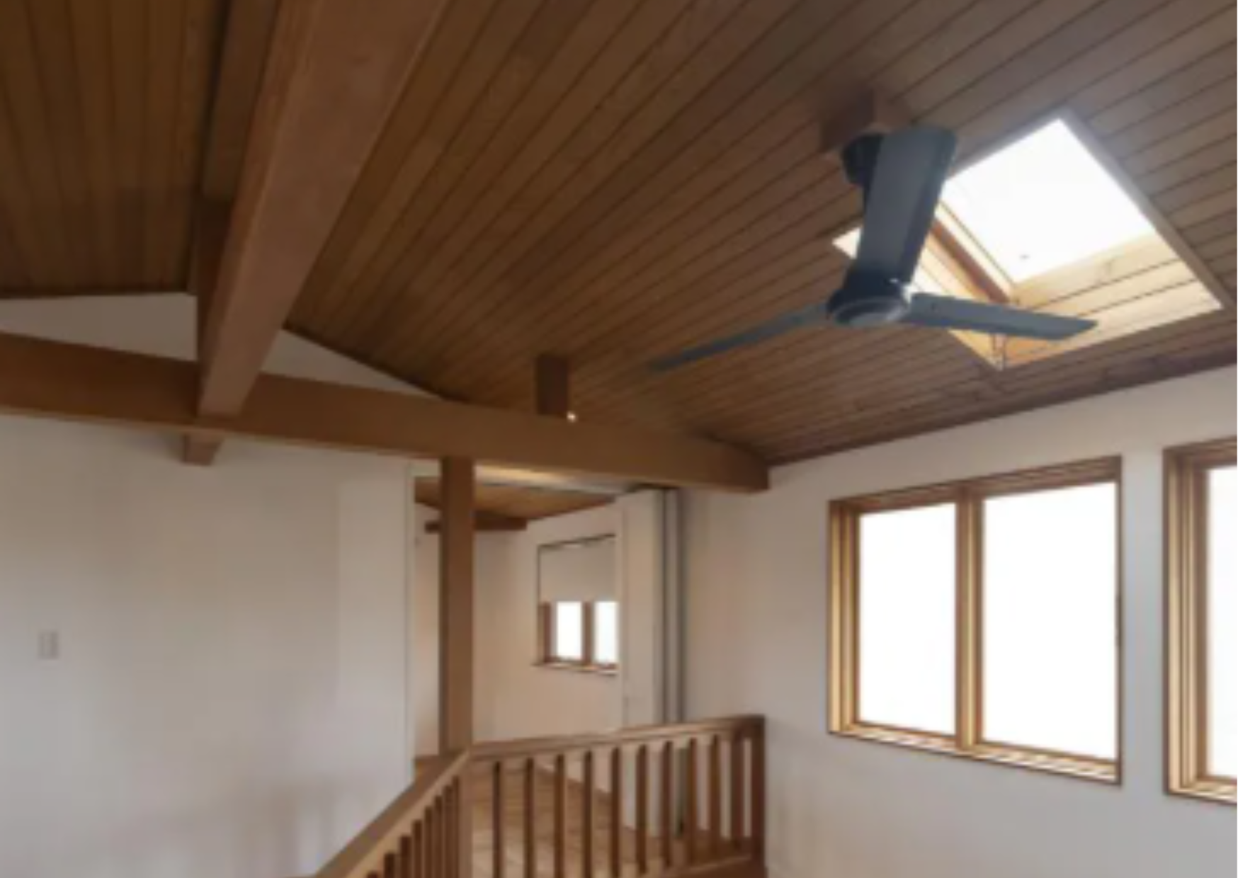 2階の廊下から見る様子。ダイニング同様、高窓や天窓から自然光が差し込みます。 天井にはファンがついているため、エアコン使用時に効率的に室温を快適にする効果も。 廊下も暑さや寒さに悩まされず、心地よくお過ごしいただけます。