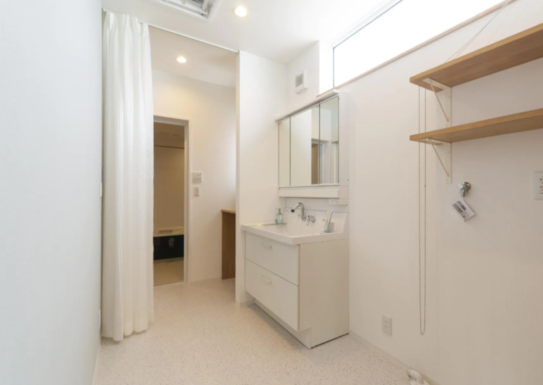 こちらの洗面所には、お風呂場に続く脱衣所とのあいだにカーテンを設置しました。