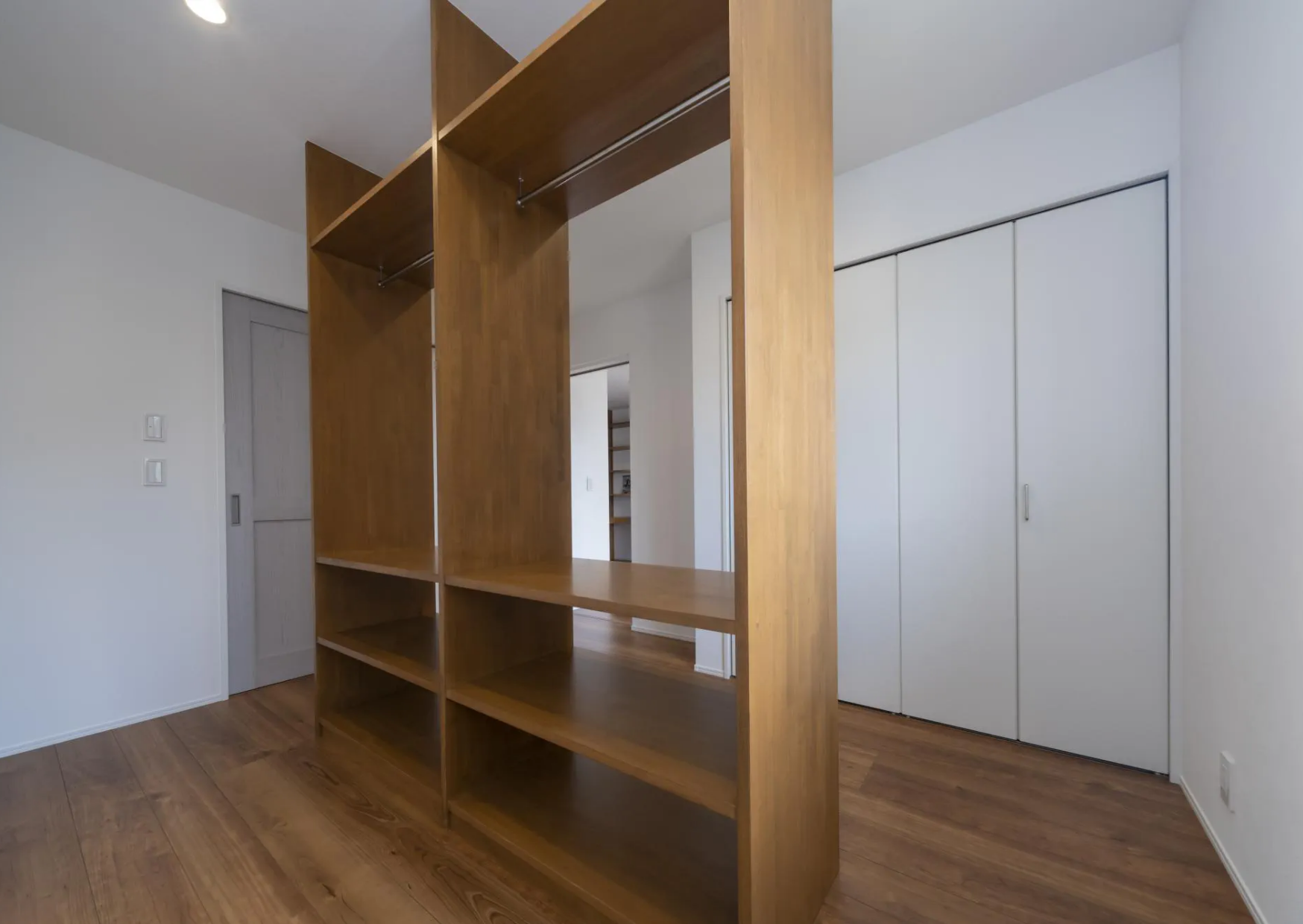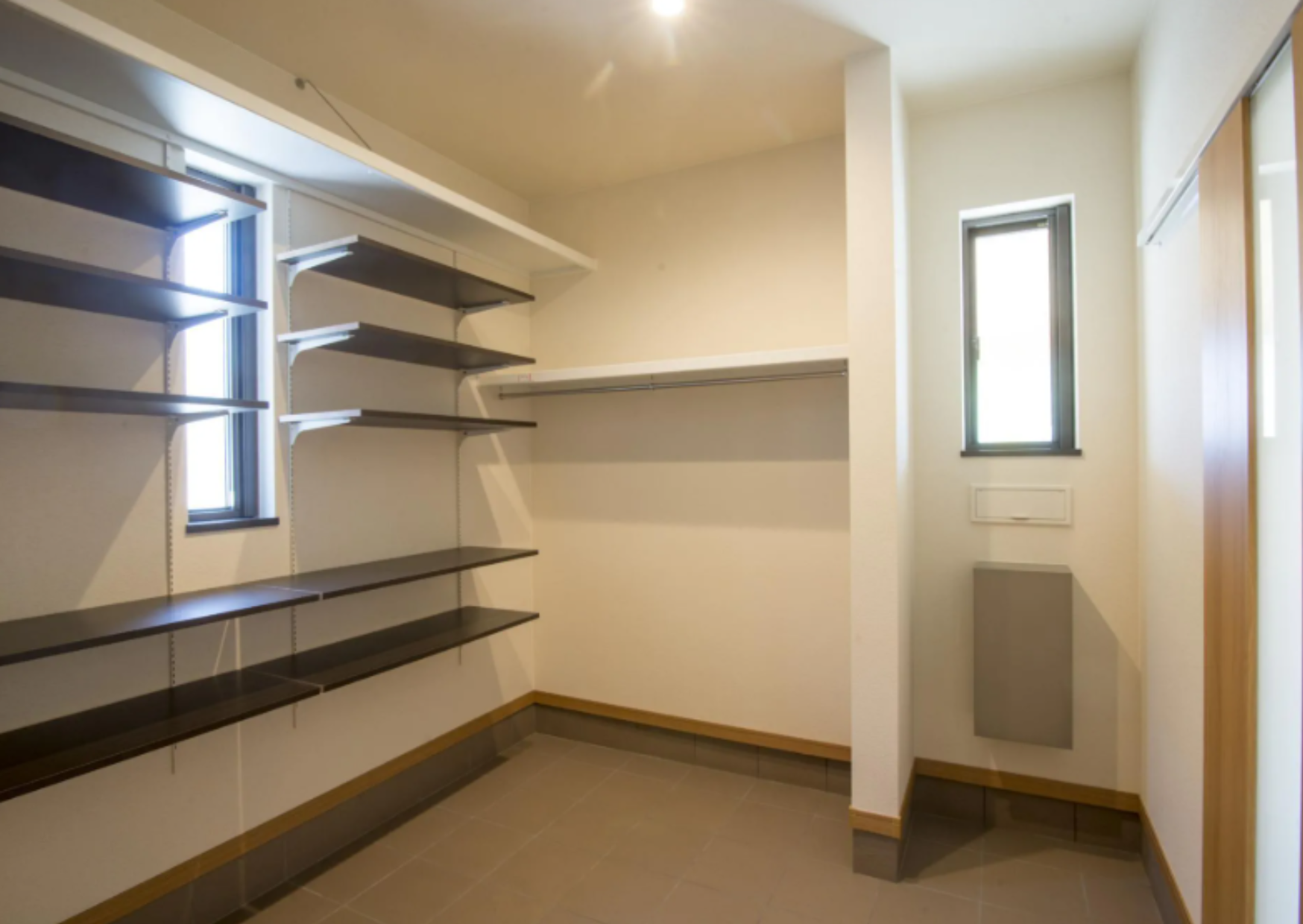 こちらは、ウォークインクローゼット。大人部屋と子ども部屋のあいだに設置し、どちらからも入れるという設計です。 洗濯物を片づける際に部屋に移動する手間が省け、家事の負担が軽減されるでしょう。