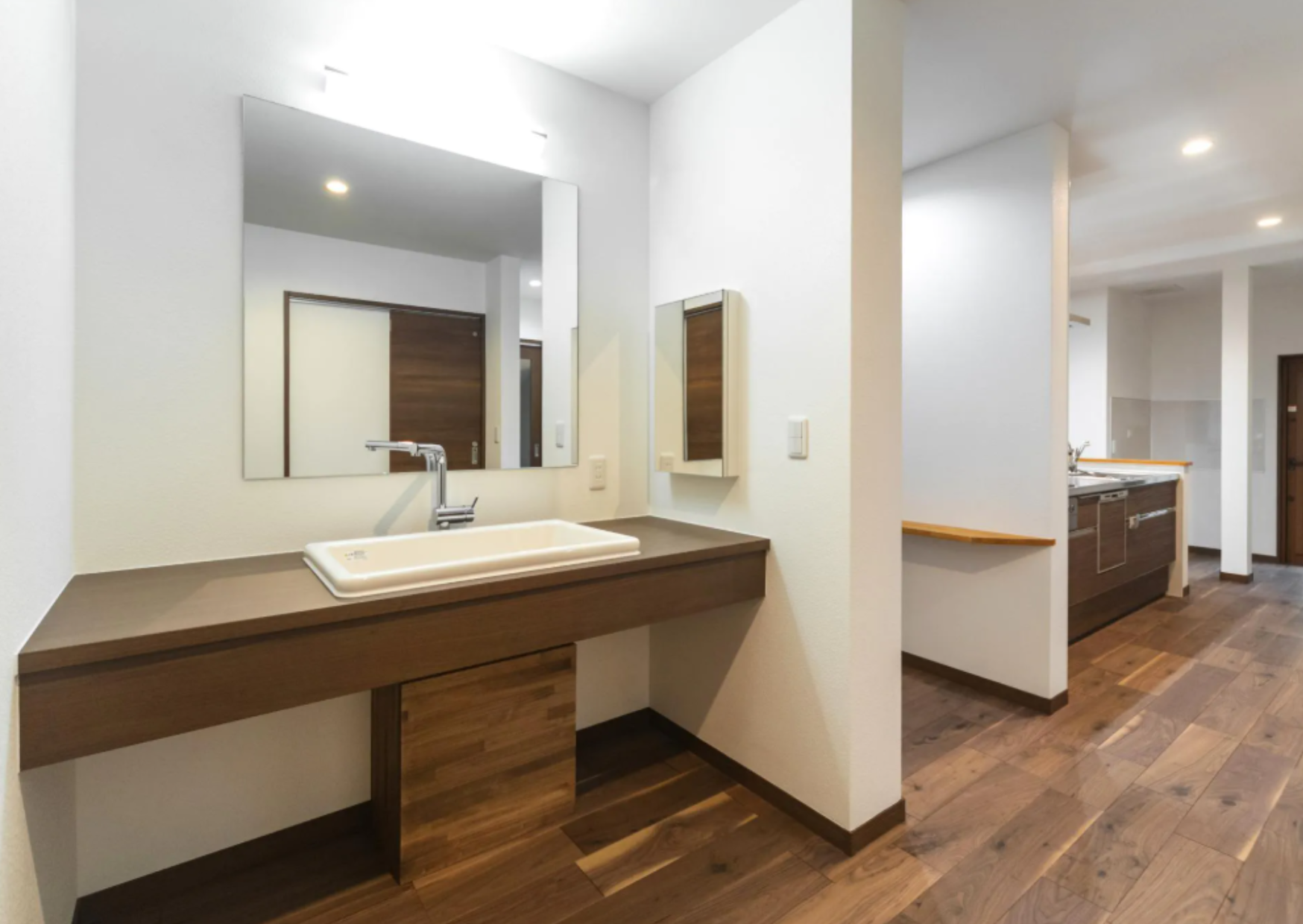 洗面所は、車いすに乗ったままでも使いやすいよう、低めに設置。 シンク下が空洞になっているため、車いすをしっかりと前まで押して使えます。