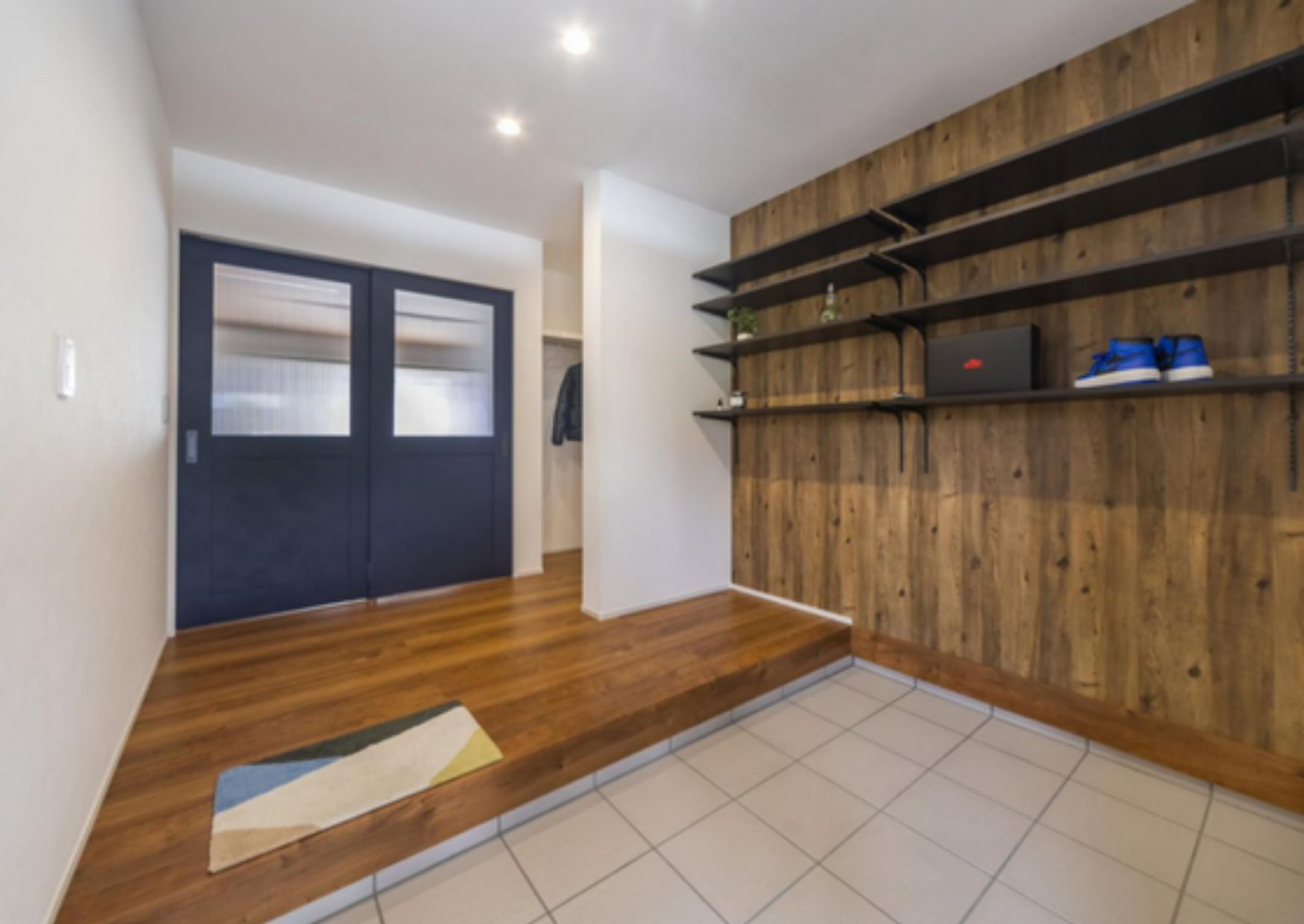 こちらは、オープン式の靴置きを兼ね備えた玄関。家族全員分の靴を、十分に収納できます。 土間部分を大きくとり、自転車を置けるように工夫しました。