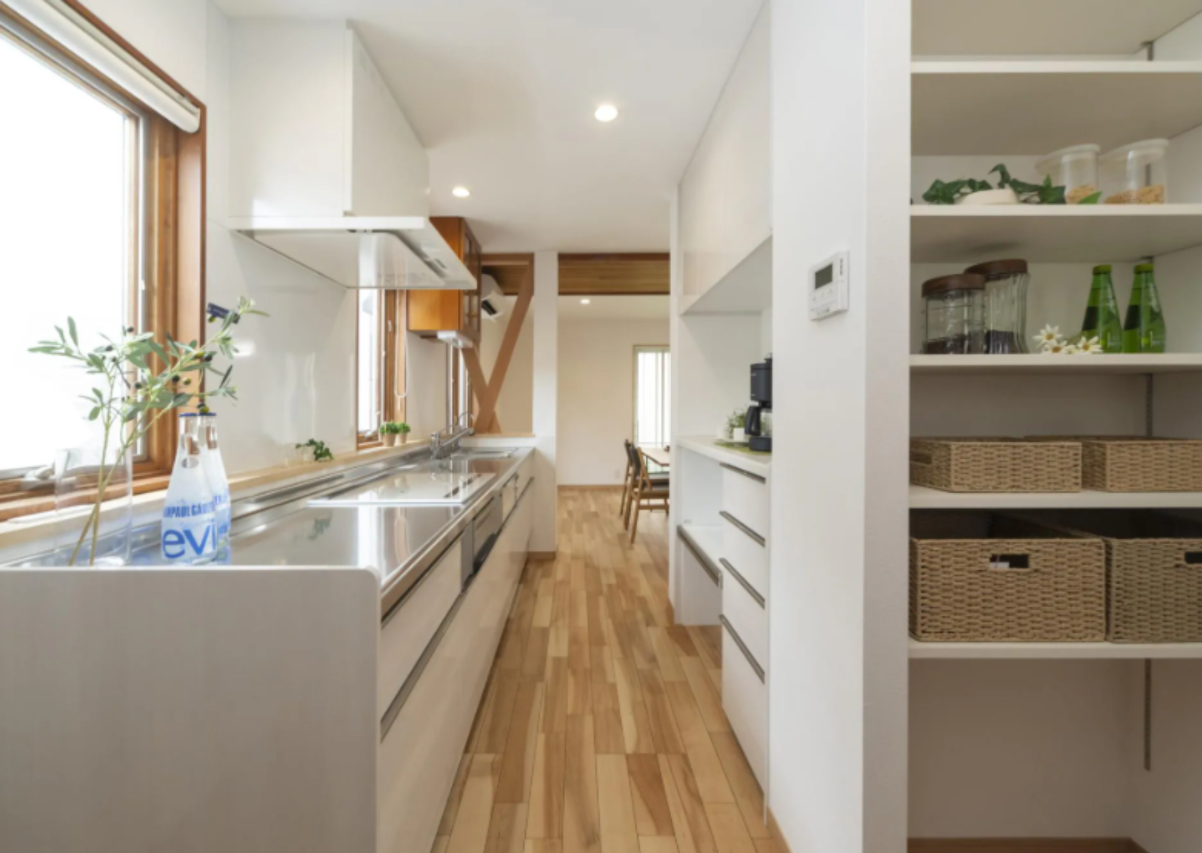 こちらのご家庭では、キッチンのすぐ後ろにウォークインパントリーを設置しました。