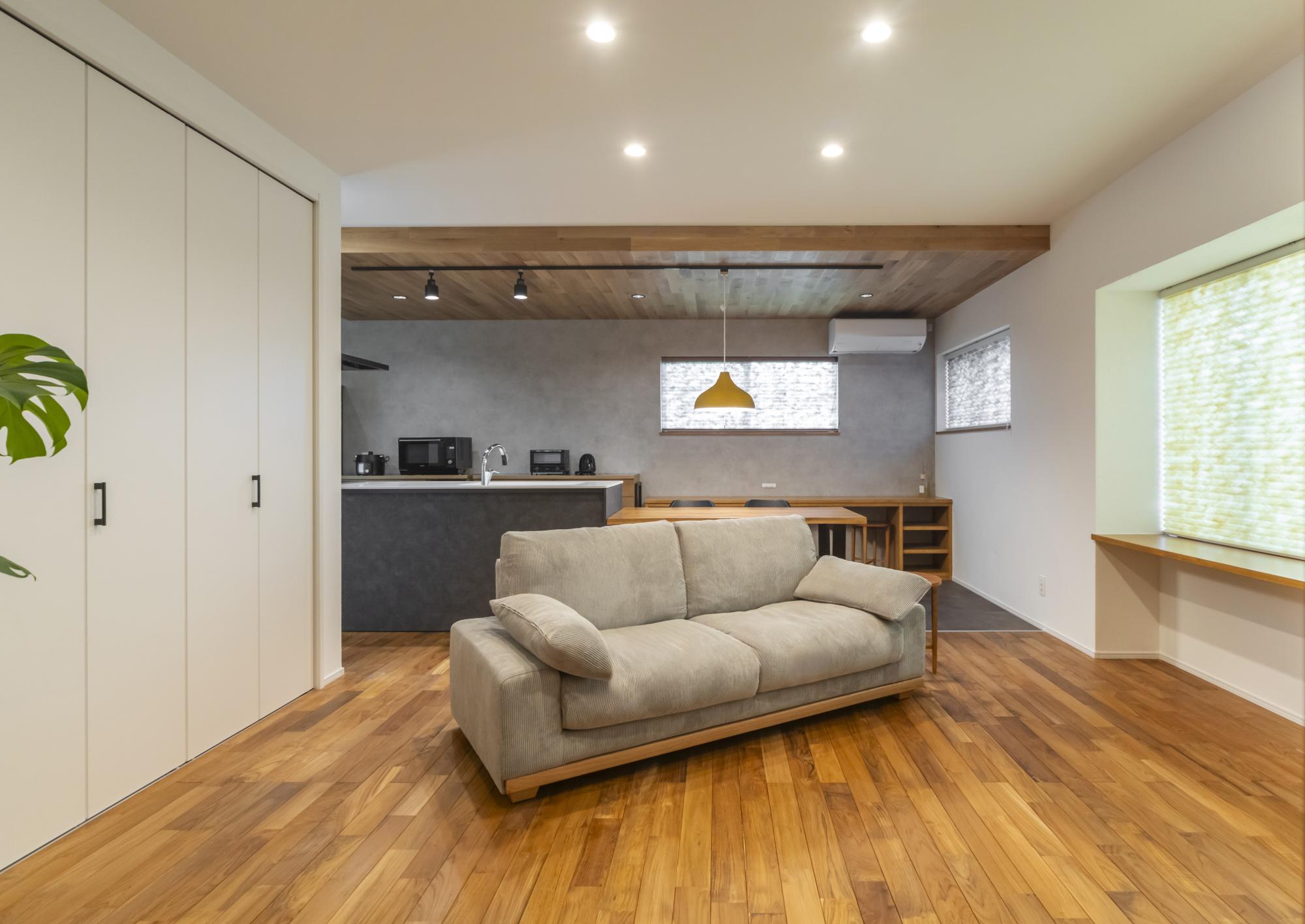 まずはリビング。濃い目の木材とパステルを基調としたインテリアが、明るくも落ち着いた雰囲気を演出。 一家が集まって、家族団らんのひとときを過ごすのに、ぴったりな空間です。