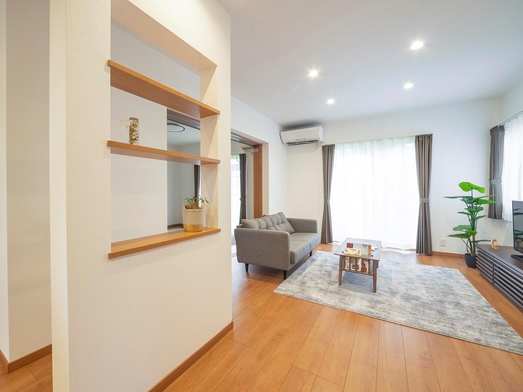 元々あったお宅が伝統的な日本家屋だったため、玄関の間取りはそのままに、リビングには和紙畳を使用して和モダンな家を実現しています。リビングの窓を広くとってあるので、自然光が差し込み、開放感あふれるのが特徴。