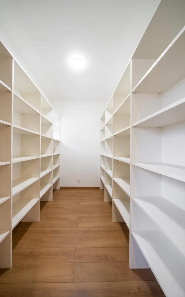 キッチン横に大容量のパントリーを設置した実例です。パントリーは暗くなりやすいので、照明をしっかり確保しましょう。センサーライトなら、手がふさがっていても自動で点灯するので便利です。コンセントも設置すれば、掃除機や調理家電の充電場所としても使えます。
