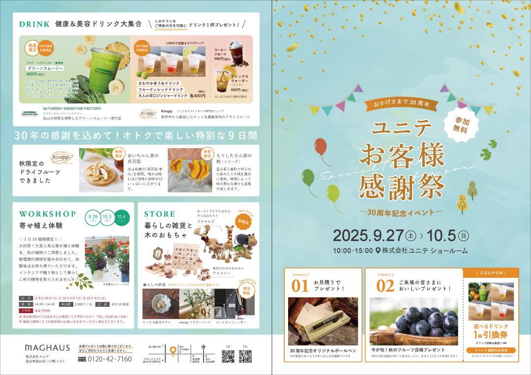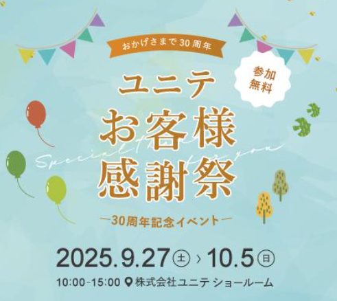 毎年恒例、秋の感謝祭イベントを開催いたします! おかげさまで、ユニテは翌2026年に30周年を迎えます。 これまで支えてくださった皆様へ、日頃の感謝をこめた特別イベントです。 皆さまのご来場を、スタッフ一同心よりお待ちしております。