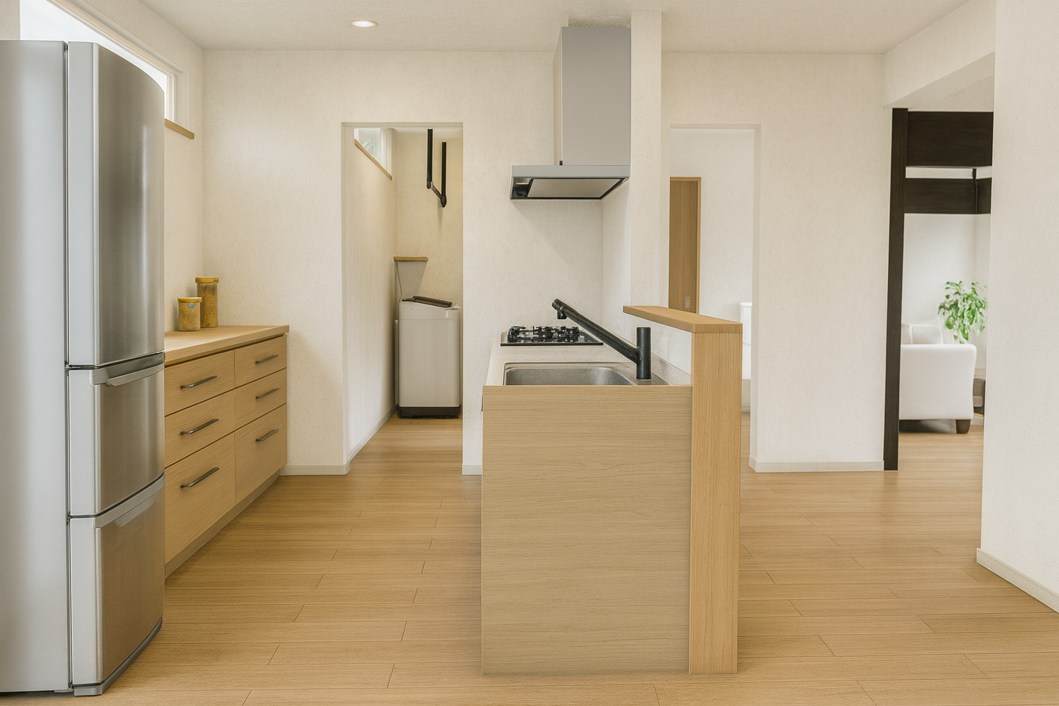 キッチンと洗面は、干すまでの家事が一室で完結できるように計画しています。