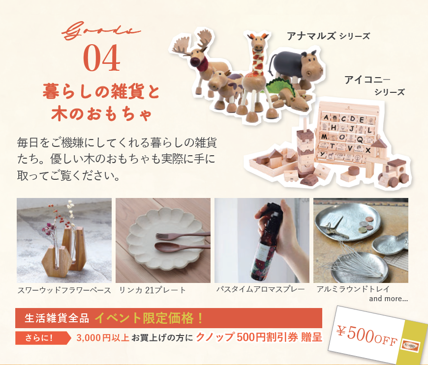 さらに、3000円以上お買い上げの方にクノップ500円割引券をプレゼントいたします。