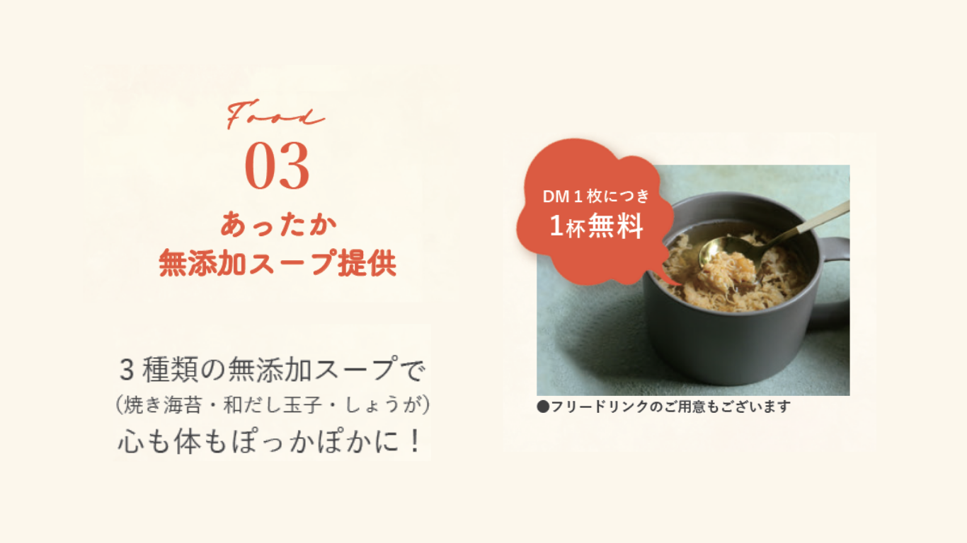 体の中からほっと温まる「あったか無添加スープ」をご用意しています。